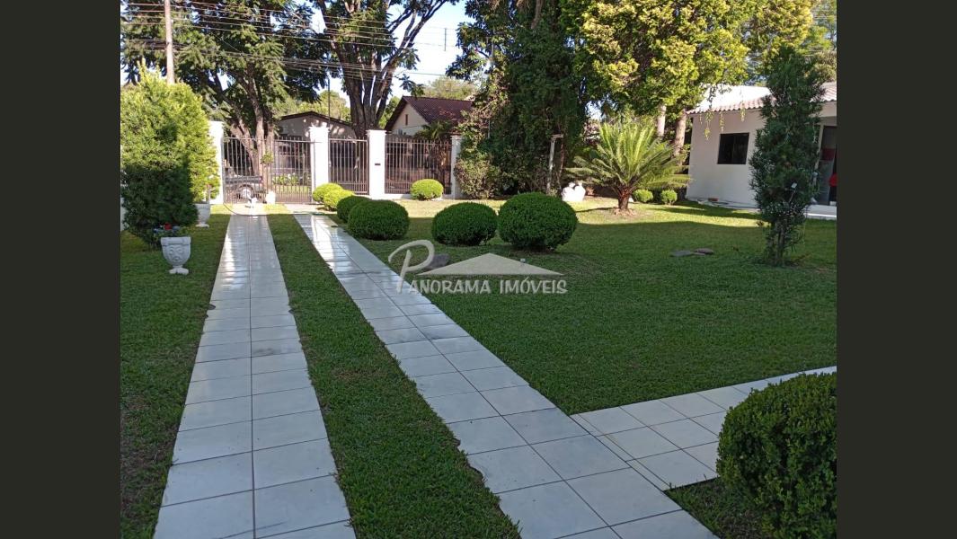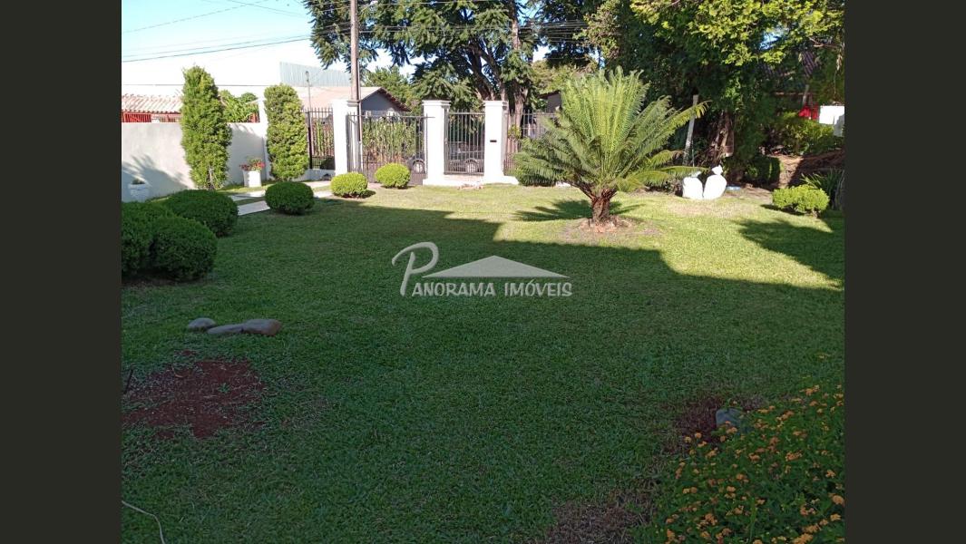 Pátio bem fechado gramado com árvores, folhagens e floreiras