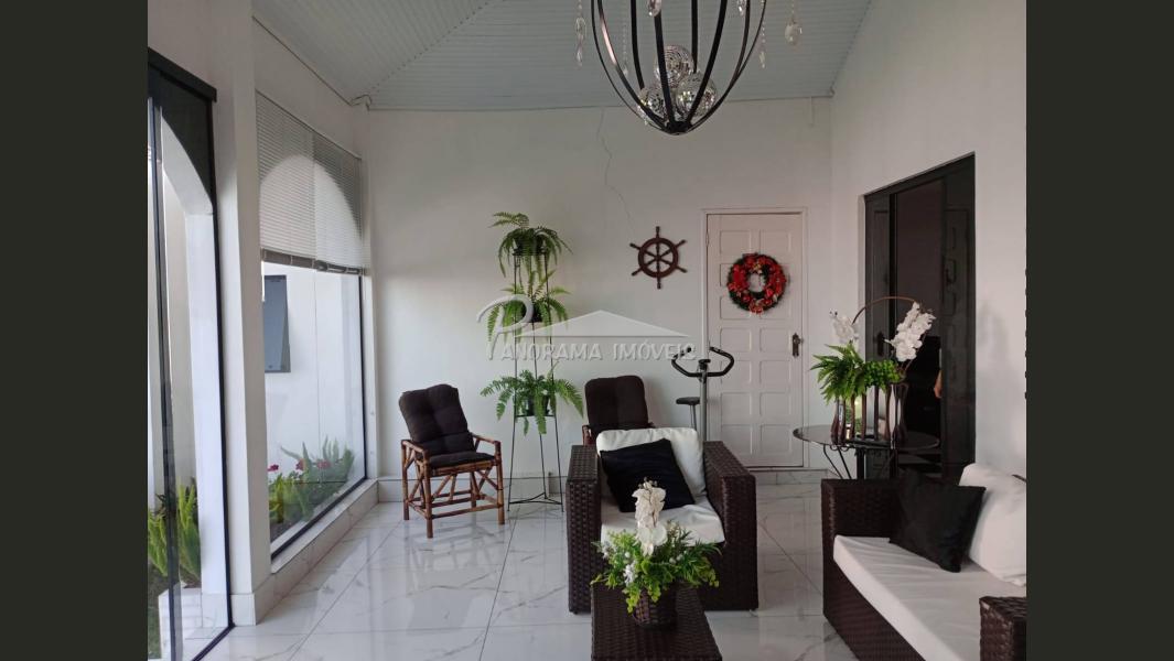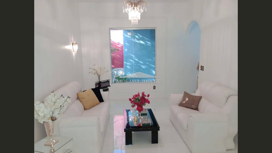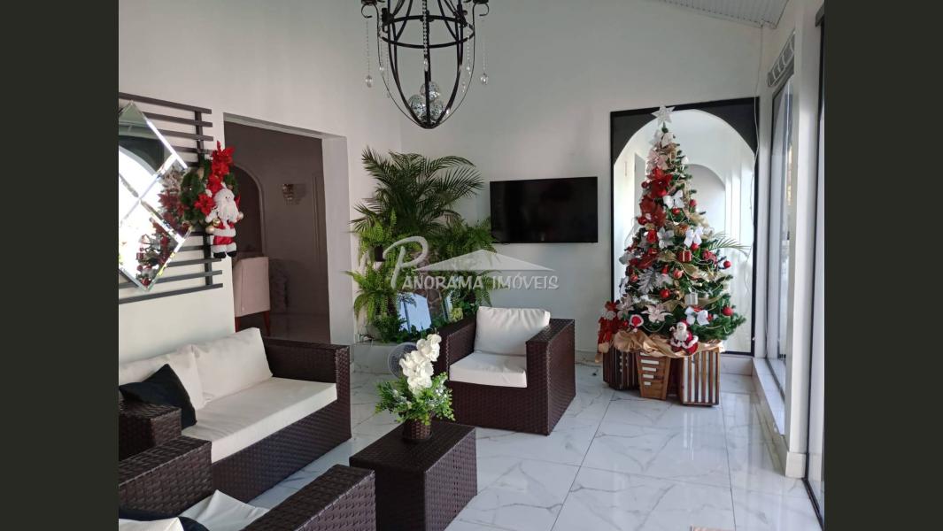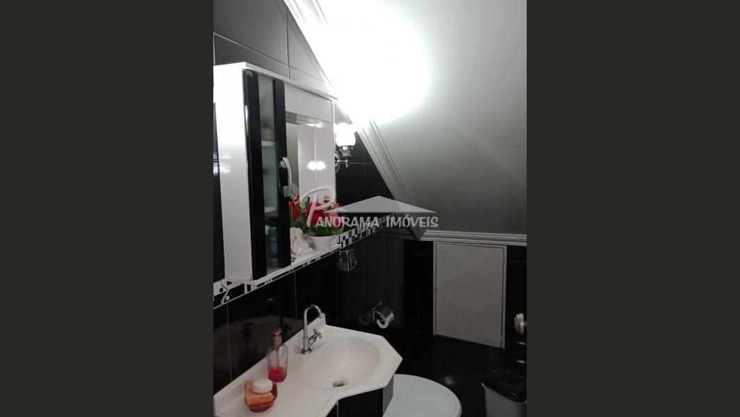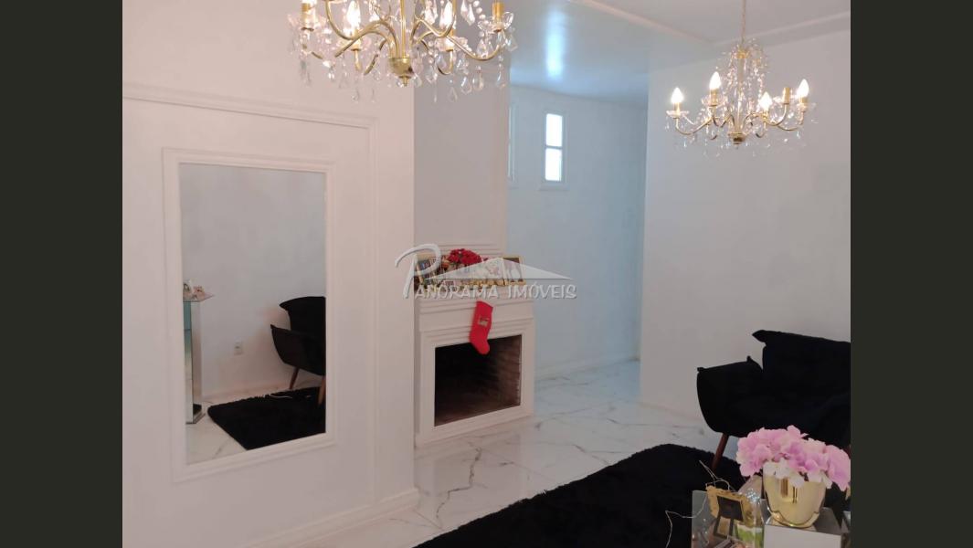 Linda casa de dois pisos com duas suítes, sendo uma com closet e sacada mais dois dormitórios, sala de circulação com lareira na parte superior.