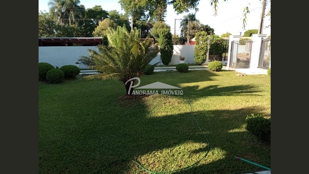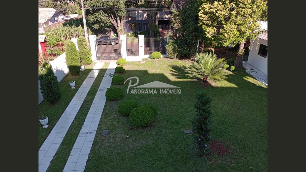 Pátio bem fechado gramado com árvores, folhagens e floreiras